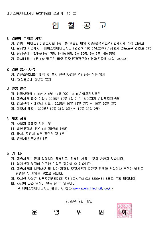 제목 | 에이스하이테크시티 1동 1층 필로티 바닥 지중등(경관조명) 교체 업체 선정 재입찰 공고(제10호) | ||