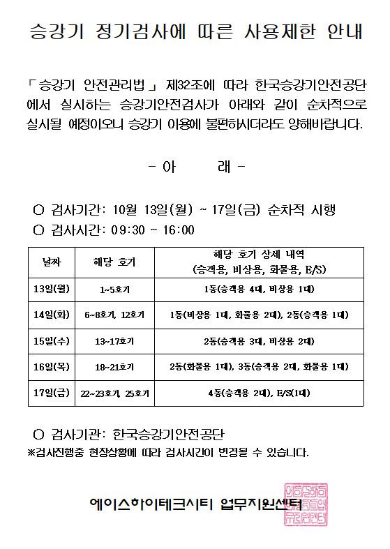 제목 | 승강기 정기검사에 따른 사용제한 안내 | ||